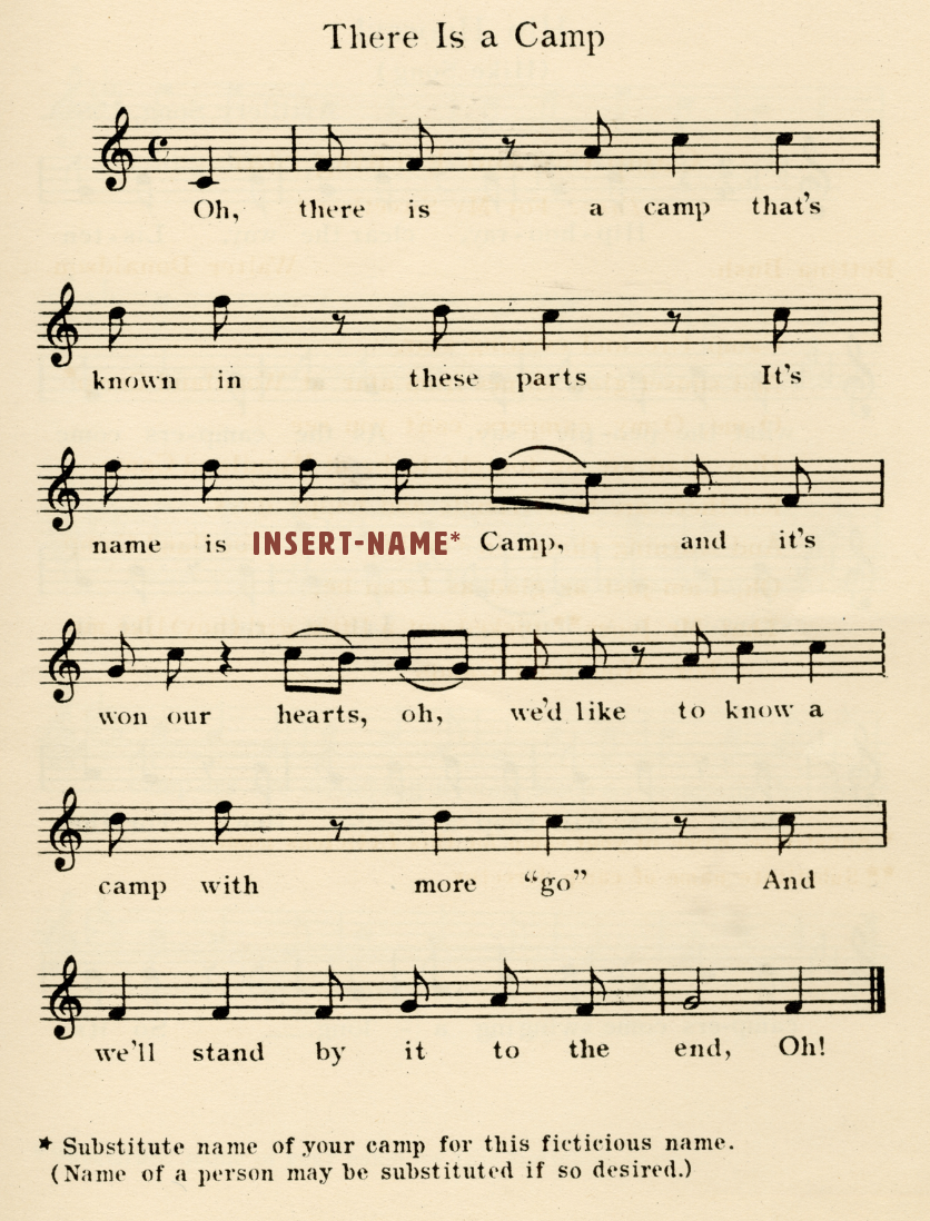 "There is a Camp" from Camp and Picnic Warbler: A Collection of Camp Songs, c. 1929. Compiled and edited by Evelyn Hopson Wood, Director of Music at Camp Parry-dise (Highlands, NC), this songbook was published for purchase by camps nationwide. Wood credited several western North Carolina camps with assistance in compiling the collection, including Camp Greystone (Hendersonville, NC), Camp Suwaili (Chimney Rock, NC), Camp Rock Creek (Brevard, NC), and nearby Camp Laurel Falls (Clayton, GA). Image courtesy of Corinne Foster Personal Collections.